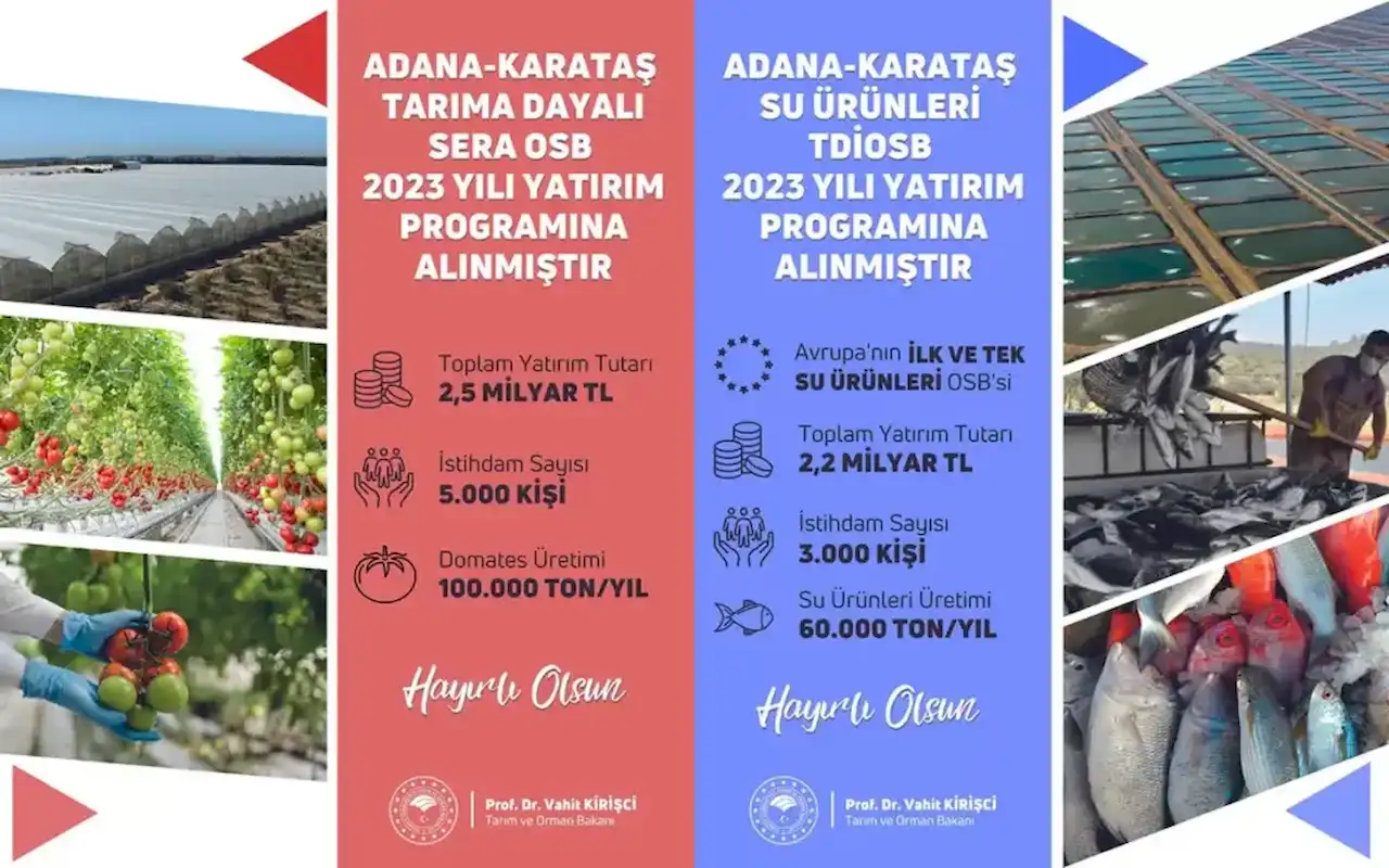 Tarım ve Orman Bakanı Prof. Dr. Vahit Kirişci, sosyal medya hesabından yaptığı açıklamada, “Tarıma Dayalı İhtisas Organize Sanayi Bölgelerimiz Türkiye Yüzyılı'na damga vuracak. Adana Karataş Sera TDİOSB, Adana Karataş Su Ürünleri TDİOSB ve Nevşehir Kozaklı Jeotermal Isıtmalı Sera TDİOSB 2023 yılı yatırım programına dahil edilmiştir. Hayırlı uğurlu olsun” dedi.