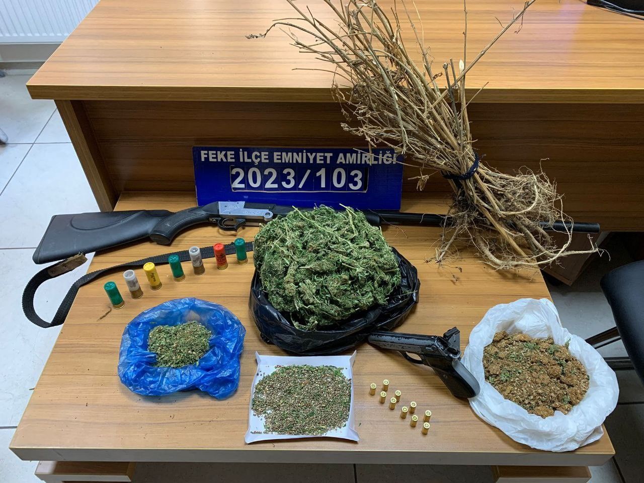 Edinilen bilgilere göre, Feke’de Cumhuriyet Başsavcılığı tarafından başlatılan soruşturma çerçevesinde Feke İlçe Emniyet Amirliği ekipleri bir eve şafak vakti operasyon düzenledi. H.O. isimli bir şahsın kaldığı evde yapılan baskında 1 tabanca, 400 gram esrar, 1 av tüfeği, tabanca fişekleri ile av fişekleri, satışa hazır 28 rulo esrar ele geçirilirken H.O. gözaltına alındı. Emniyetteki işlemlerinin ardından adliyeye sevk edilen şüpheli adli kontrol şartıyla tutuksuz yargılanmak üzere serbest bırakıldı.