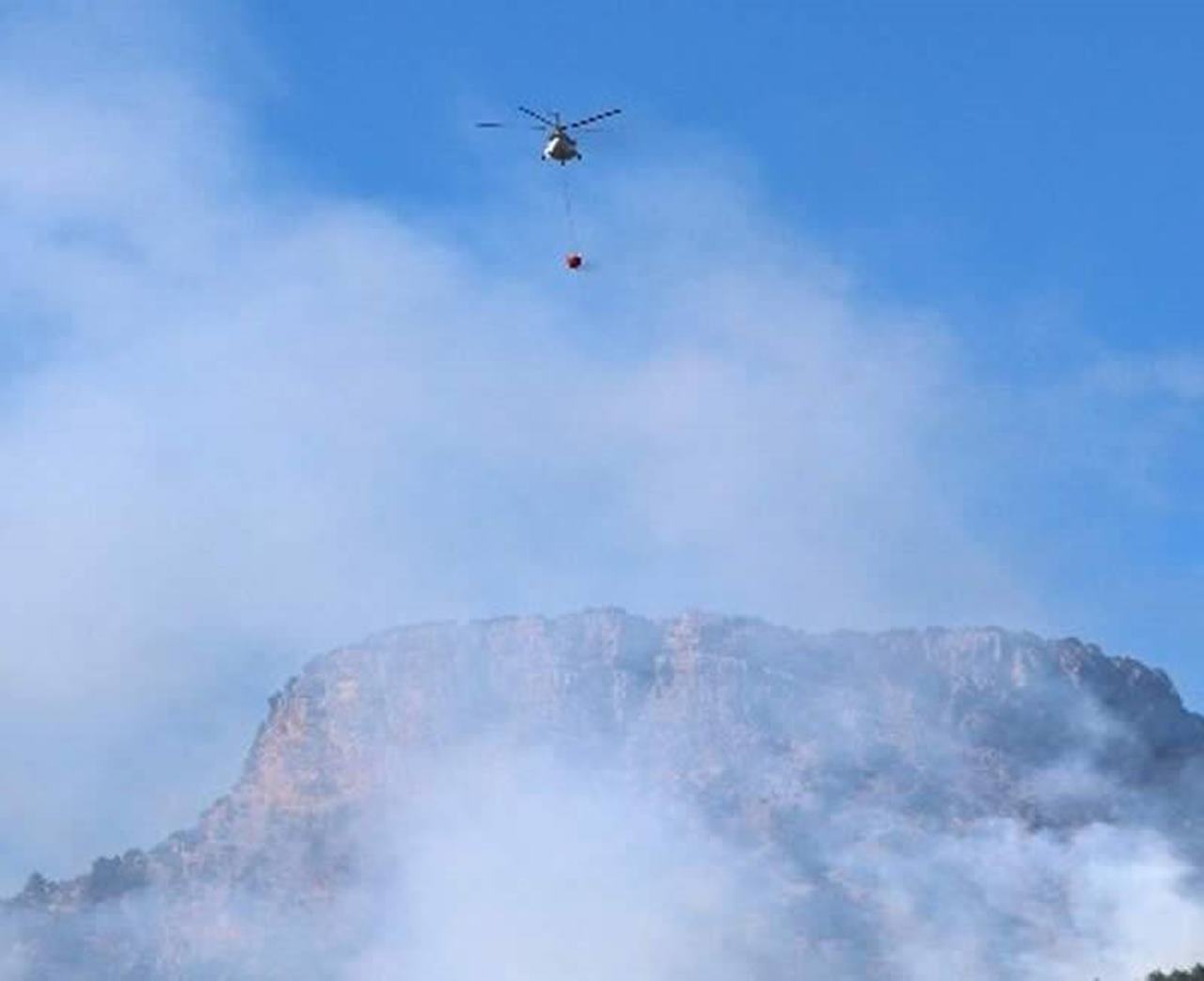 Gece boyu ekiplerin karadan müdahalesi sürerken günün ilk ışıklarında yangına söndürme helikopteriyle de müdahale ediliyor.