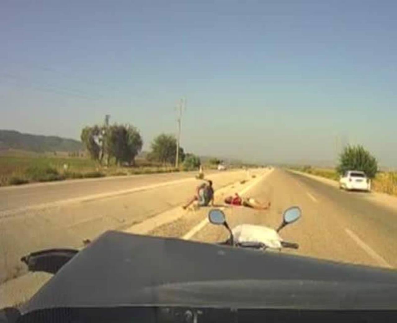 Adana'da, yolun sol şeridinde ilerleyen otomobilin, arkadan çarptığı motosiklet sürücüsü Umut Sezik (30) metrelerce yükselip, başını asfalt zemine çarparak ağır yaralandı. Motosikletteki yolcu konumundaki Berat Coşgun'un da yaralandığı kaza anı otomobilin araç kamerasına saniye saniye yansıdı.