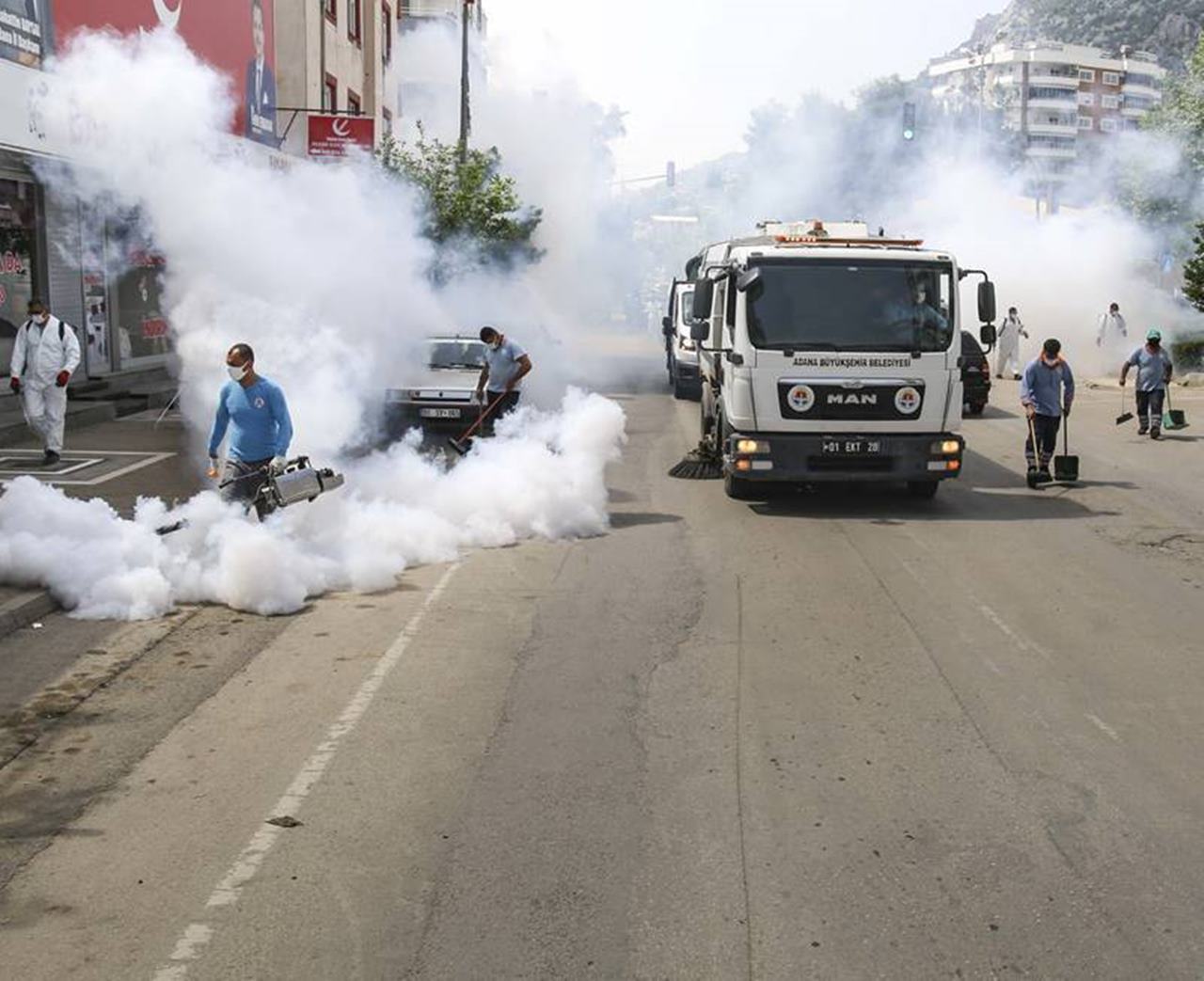 Koronavirüs ile mücadele kapsamında 17 Mayıs 2021 tarihine kadar sürecek tam kapanmayla birlikte Adana Büyükşehir Belediyesi, boşalan cadde ve sokaklarda temizlik, ilaçlama ve dezenfekte çalışması yapıyor.