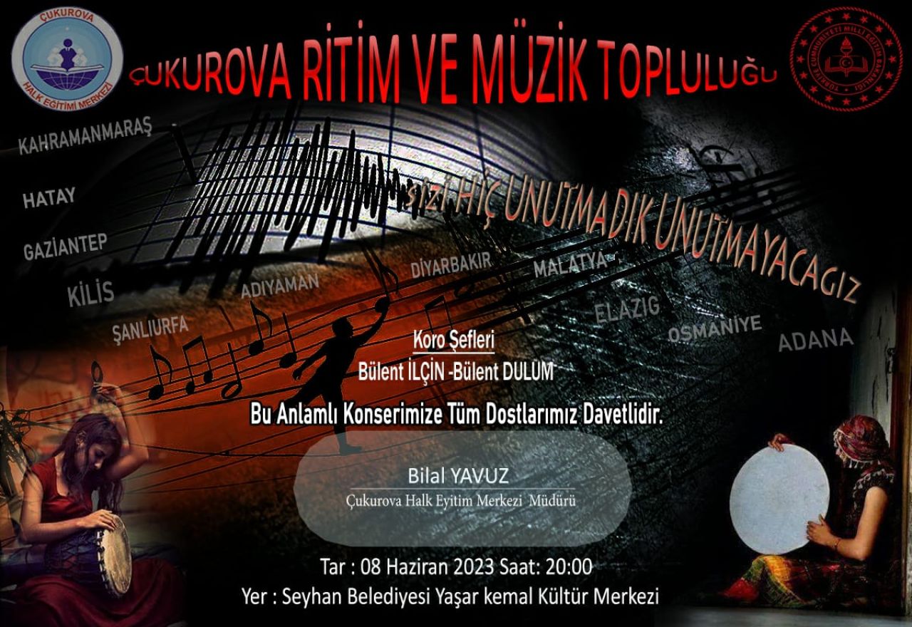 Böyle olumsuz şartlar ortadayken gönüllü olarak bir araya gelen Çukurova Ritim ve Müzik Topluluğu kendine edindiği sosyal sorumluluk kapsamında konserler düzenliyor. Çukurova Halk Eğitim Merkezi öncülüğündeki bu konserlerin son örneğini Seyhan Belediyesi Yaşar Kemal Kültür Merkezi'nde önümüzdeki Perşembe günü (8 Haziran 2023) Saat 20'de gerçekleştirecekler.