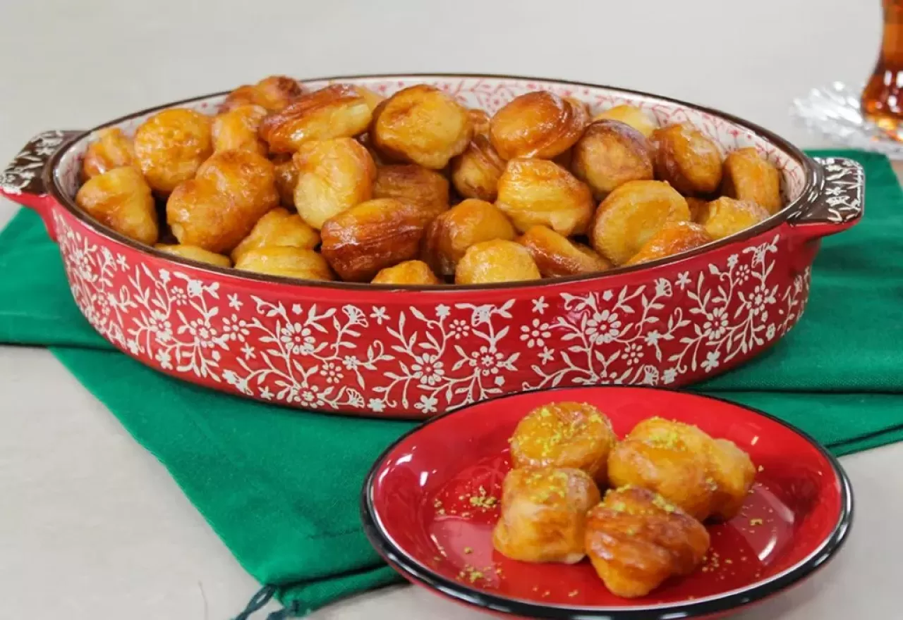 - Kızaran hamurları şerbetin içine koyup kaşıkla her yerine gelecek şekilde karıştıralım 5 dk kadar bekledikten sonra servis tabağına alıp servis edelim.